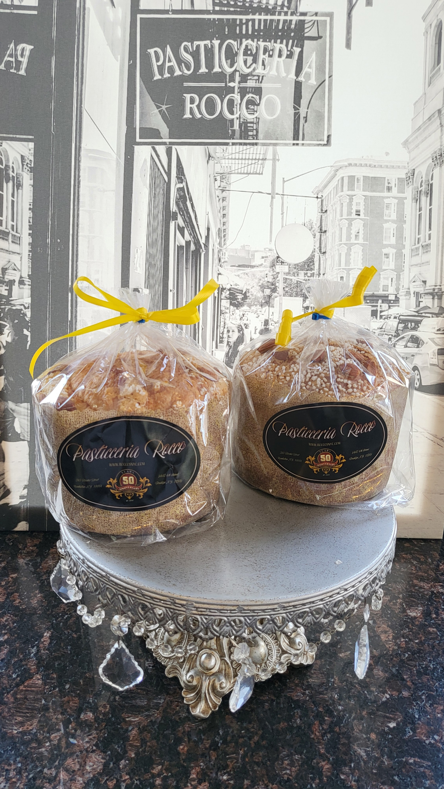 An Almond Flavored Sweet Bread Topped with Almond Paste, Toasted Almonds & Confectioners Sugar pellets